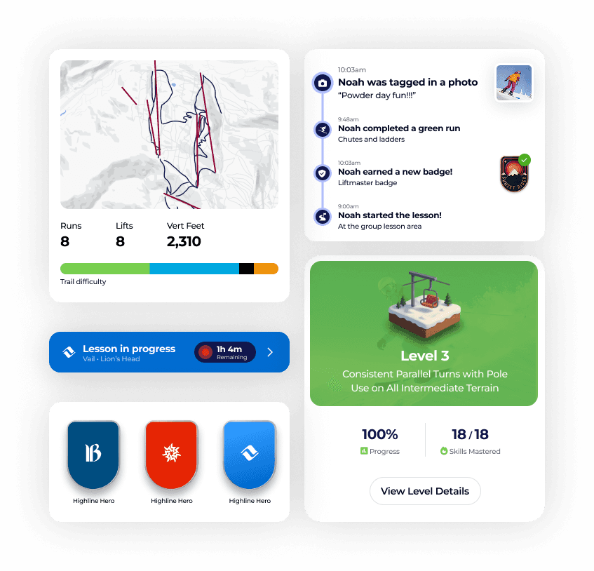 I designed a gamified experience that offers digital check-in, showcases skills progression, and provides real-time lesson updates.